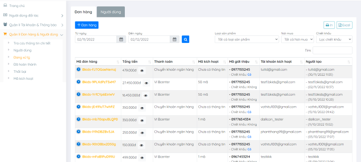 • Đại lí có thể truy cập vào Quản lí Đơn hàng & Người dùng, vào mục Đang xử lí hoặc Đã hoàn thành.